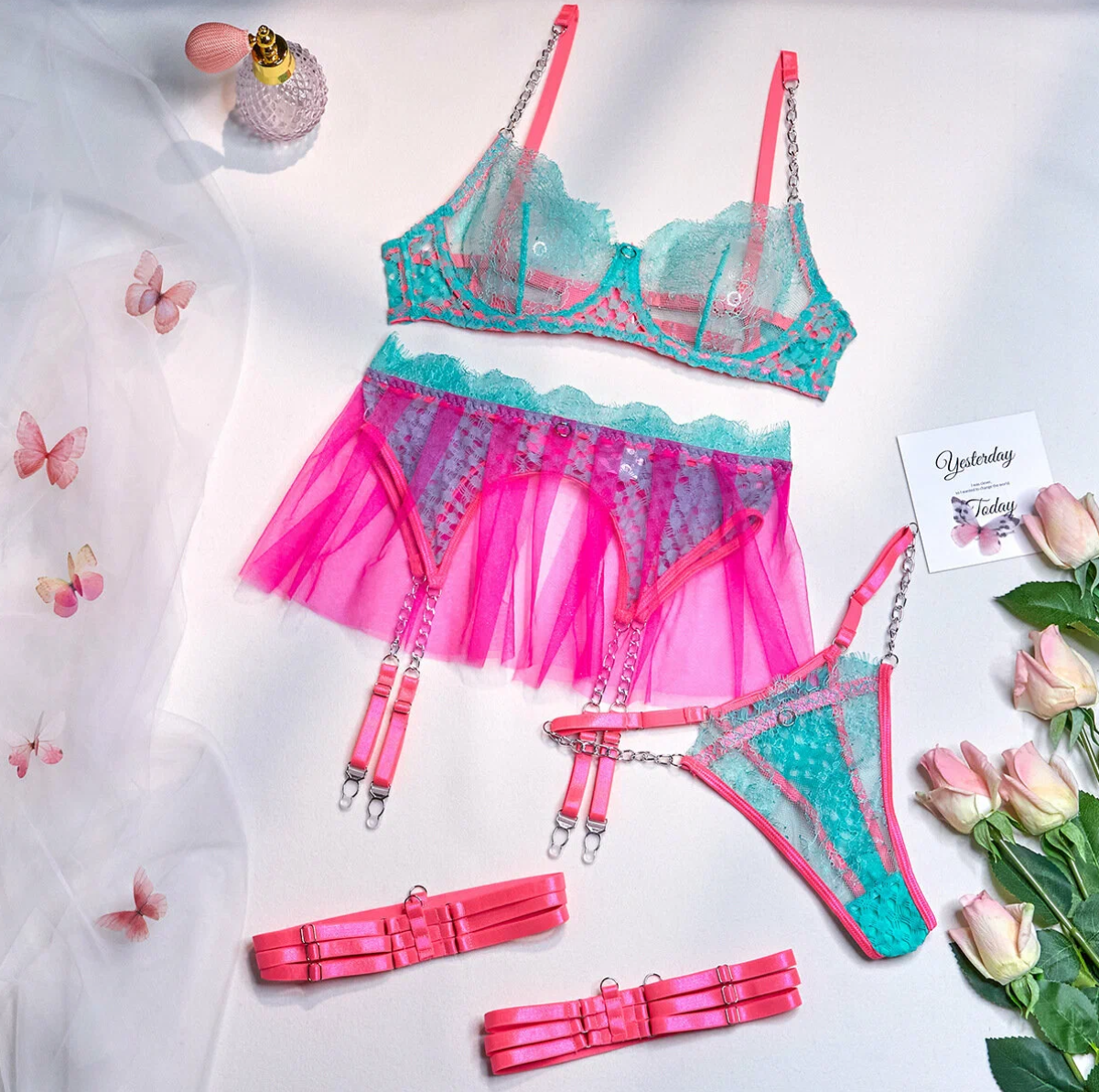Алегро невероятно яркий комплект сексуального белья сделает Вас богиней секса. Кокетливая розовая юбочка из сетки оттенит изгибы бёдер.