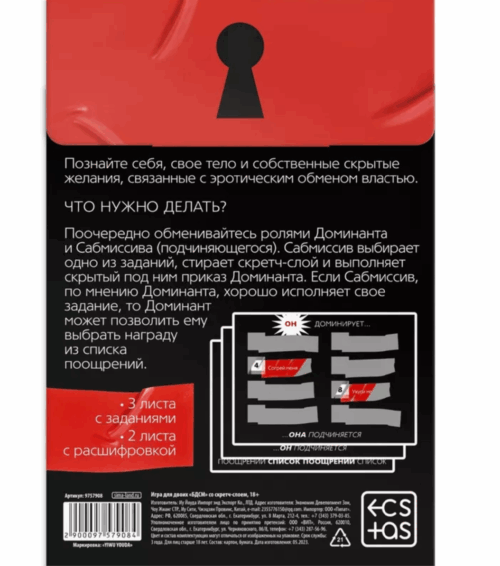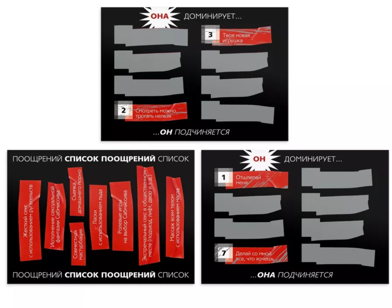 БДСМ игра с уклоном в доминацию и подчинение состоит из 3 карточек. Одна карточка с заданиями для него, вторая карточка с заданиями для нее, а третья карточка предложит варианты поощрений.