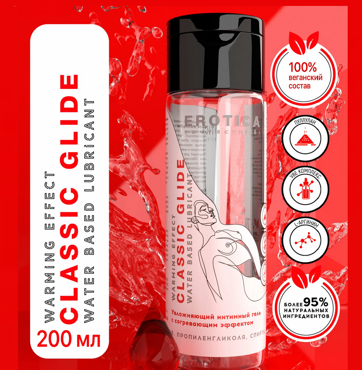 Classic Glide Erotica лубрикант на водной основе который усилит ощущения от каждого прикосновения. Возбуждающие микрочастицы в составе смазки разогревают и усиливают ощущения от сексуального акта.