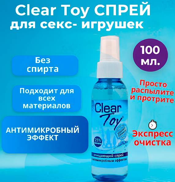 Clear Toy безопасный антисептик для игрушек не содержит спирта и не разрушает силиконовые игрушки. Средство обеззараживает за считанные секунды и не оставляет следов на поверхности игрушек. Подходит для использования с предметами из силикона, киберкожи, пластика и стекла.