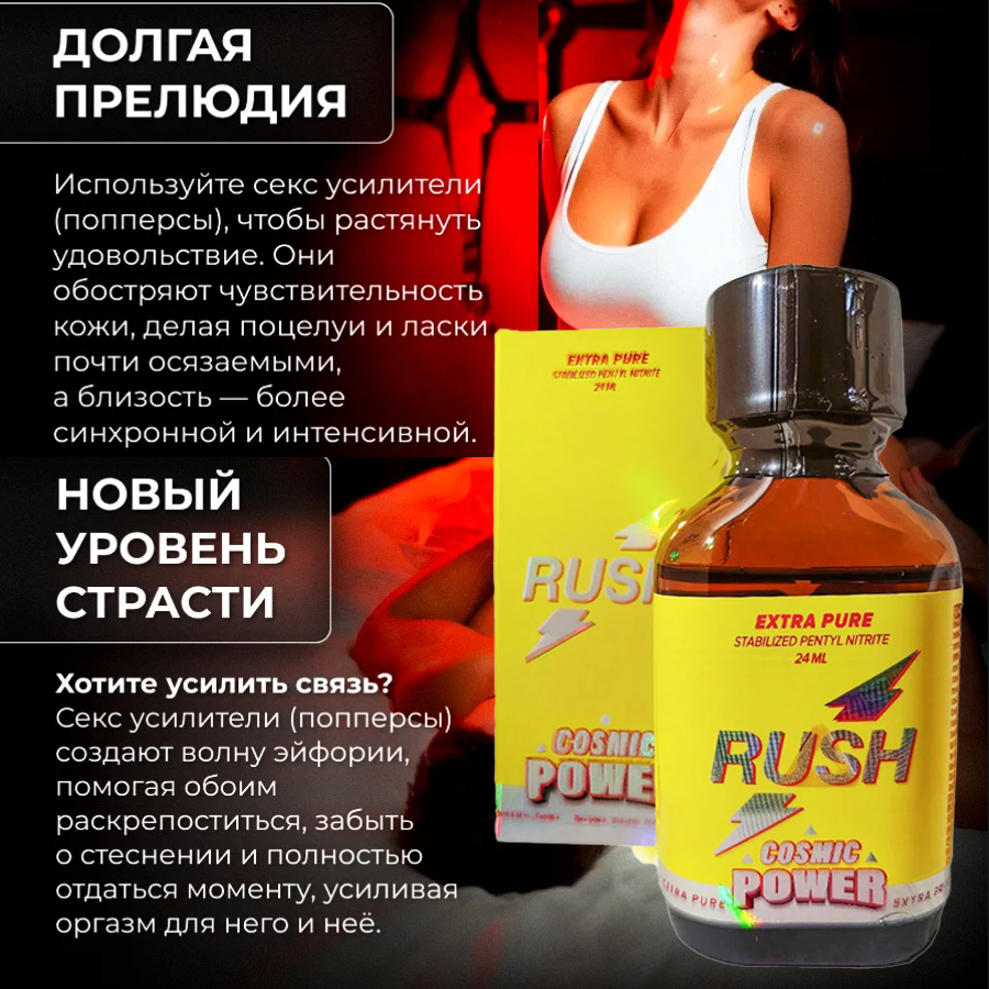 Cosmic Power Rush попперс средней крепости уникален в своей формуле. В составе присутствует одна из самых чистых и сильных форм пентилнитрита, а также таинственный ингредиент, который делает этот продукт поистине особенным. Специально подобранные компоненты создают неповторимый энергетический заряд и вызывают сенсационные ощущения, которые вы оцените по достоинству.