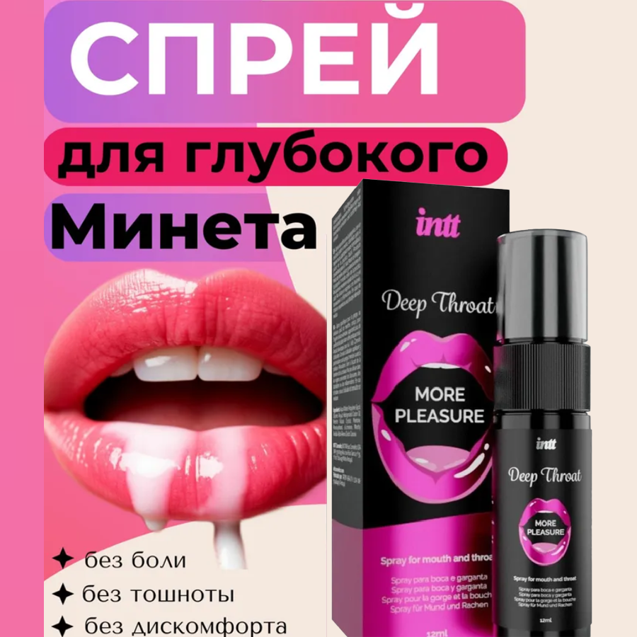 Deep throat intt спрей для глубокого минета распыляется в горло и снижает ощущения, тем самым ослабляя рвотный рефлекс. Легкий мятный вкус обеспечит повышенное слюноотделение, а входящий в состав ментол создаст двойное воздействие тепла и холода, тем самым возбудит чувствительность пениса.