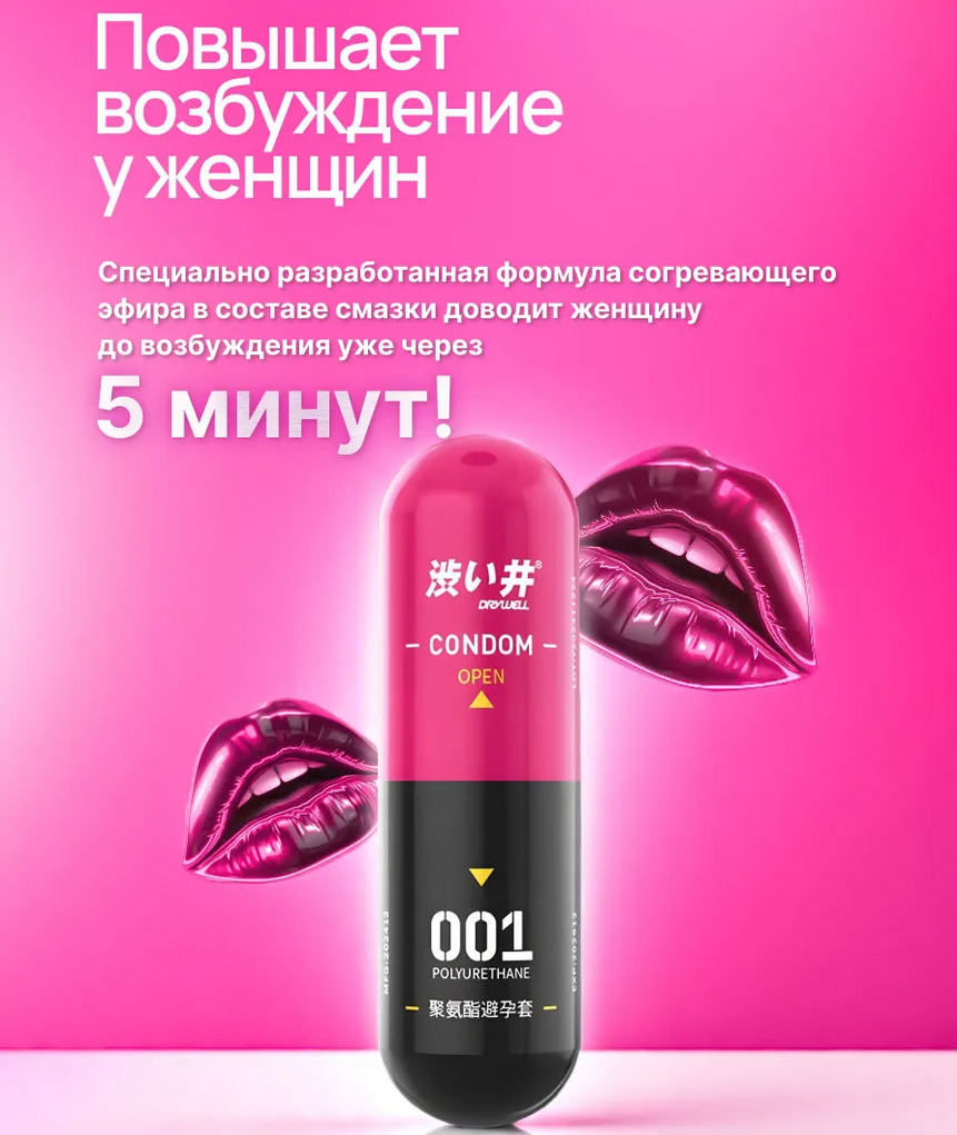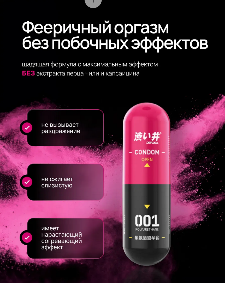 Dry Well в чёрно-розовой упаковке покрыт снаружи возбуждающей водной смазкой. Презерватив повышает чувствительность влагалища, усиливая ощущения девушки в несколько раз. Это самые тонкие презервативы, с толщиной стенки 0,01 мм. Кондомы изготовлены из супертонкого но при этом прочно материала — полиуретана. Полиуретан не вызывает аллергии, в отличие от латекса, и не вызывает зуда и раздражения. Презервативы Dry Well упакованы в удобную капсулу, которая удобна в ношении, и капсулу можно легко вскрыть одной рукой.