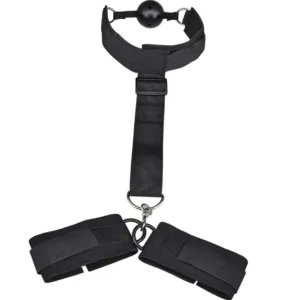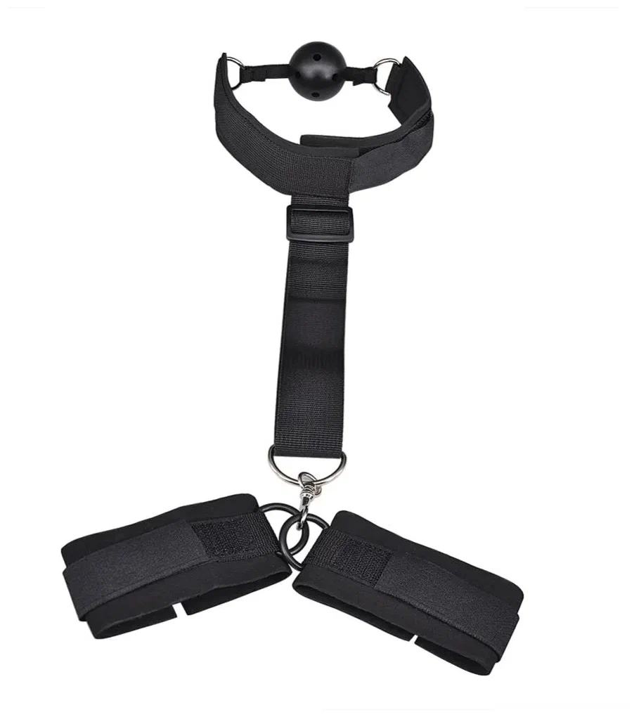 Фабула кляп с ремнём и наручниками — удобное устройство для обездвиживания партнёра.