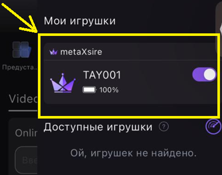 Вибротрусики появятся в приложении под названием TAY001, переведите ползунок подключения игрушки вправо.