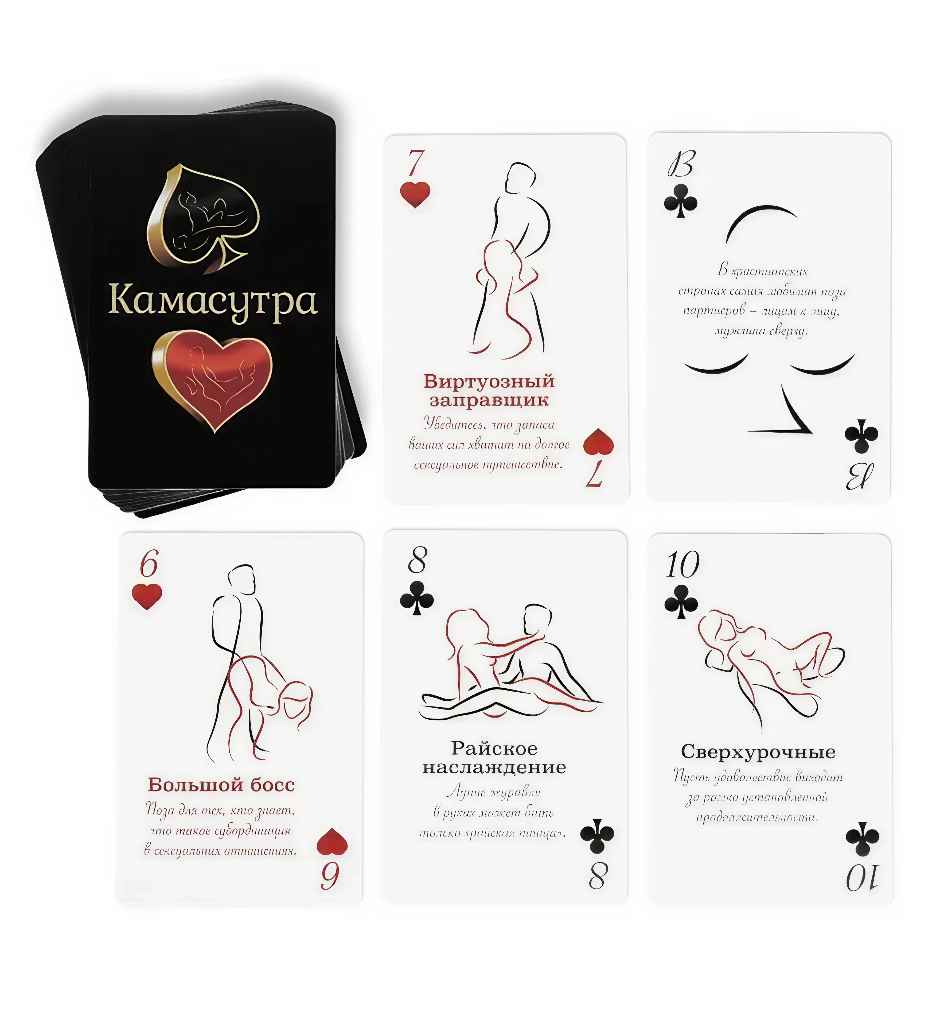 Камасутра карты с секс позами — классическая колода в новом исполнении: на каждой карте вы найдёте интересные позы для ночи необузданной страсти. Раздавайте карты, играйте, переводите, подкидывайте, отбивайтесь и воплощайте самые смелые фантазии, ориентируясь на подсказки на картах.