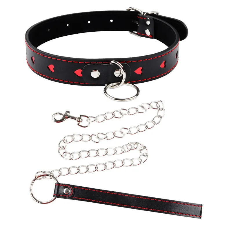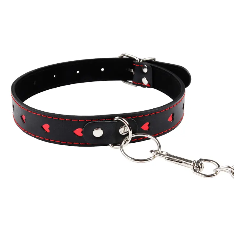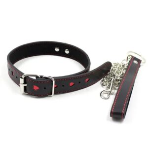Аккуратные красные сердечки на ошейнике придают немного смягчают дизайн аксессуара. Поводок фиксируется в металлическом кольце на ошейнике при помощи карабина. Увесистая металлическая цепь придаст веса Вашим приказам нижнему.