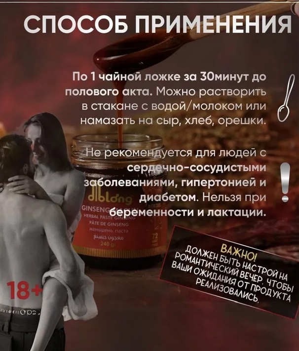 Применение: для разового применения следует принимать пол чайной ложки за 20-30 минут до секса.