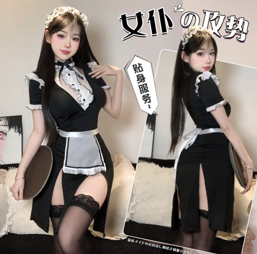 Белая манишка с воротником-стойкой придаёт костюму умеренную скромность. Белый фартук с оборками и ободок с чепчиком завершают потрясающий секси образ.