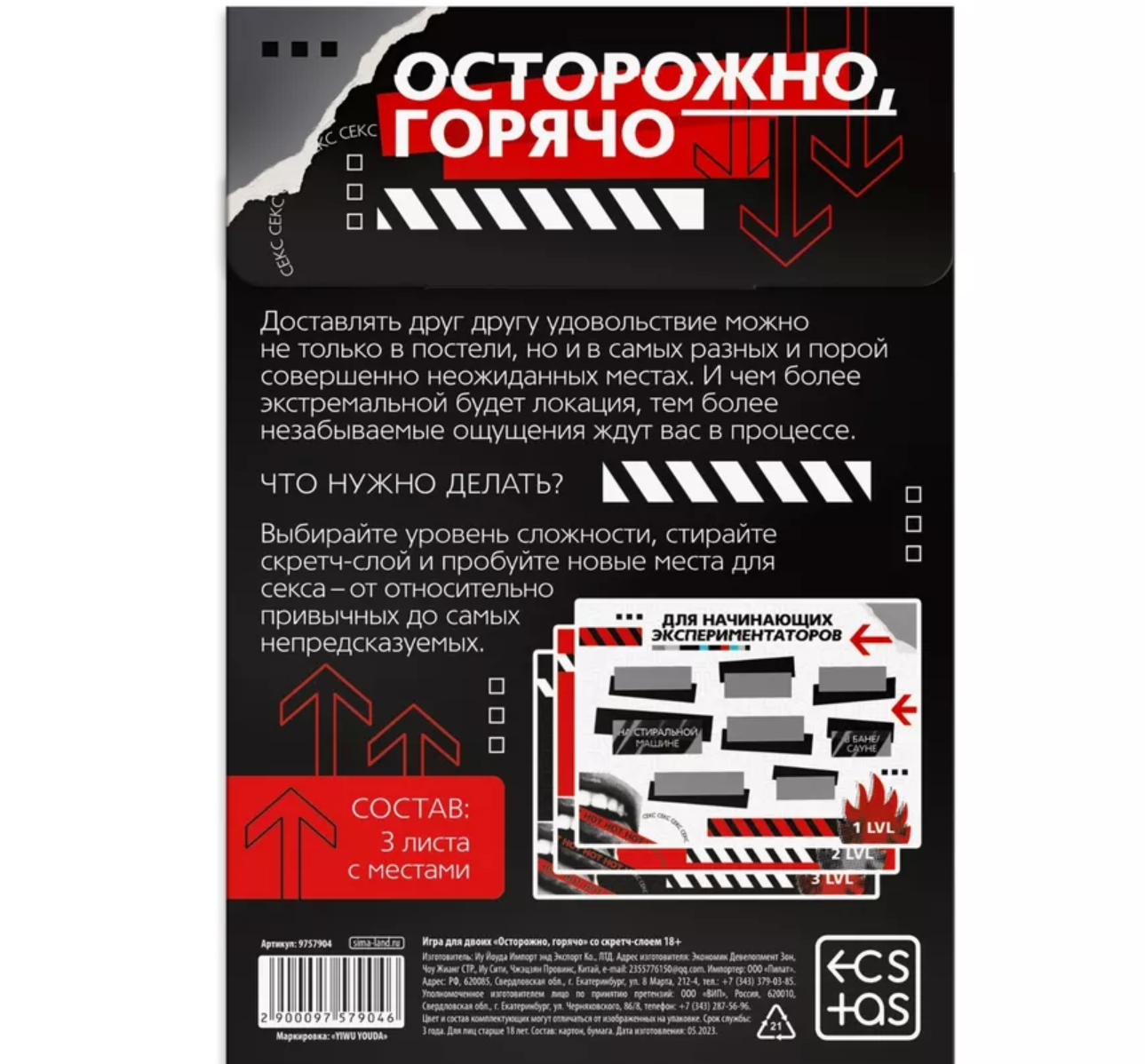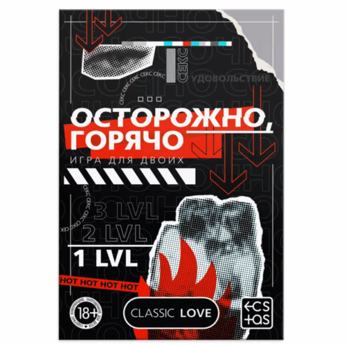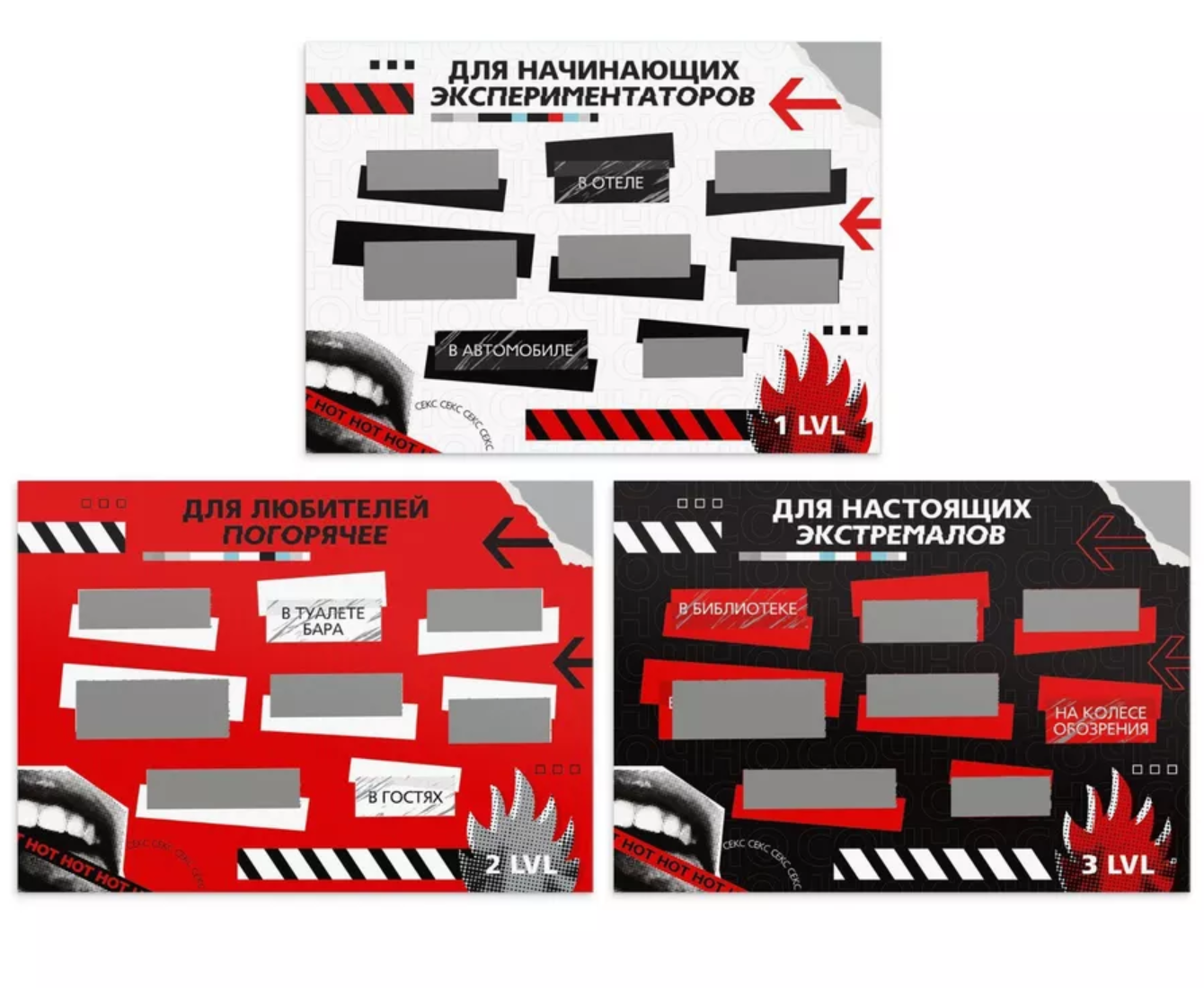 В наборе три карточки, которые делятся по уровням: для начинающих, для любителей погорячее, для настоящих экстремалов. Стирайте по одному полю на карточке и открывайте для себя новые места для жаркого секса.