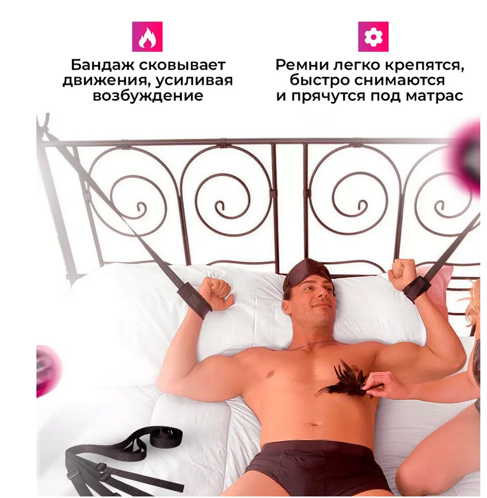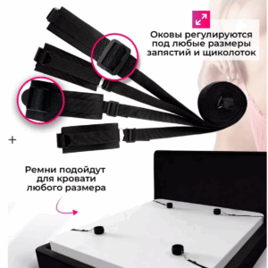 Это отличный набор для привязывания к любой мебели. Большое количество ремней позволяет привязать партнёра на поверхностях, где не за что зацепиться. Это может быть диван без ножек или обычный матрас. Длину ленты всегда можно ограничить обычным узлом. Четыре ленты позволят зафиксировать все конечности. Длина каждого ремешка легко регулируется пластиковыми бегунками.