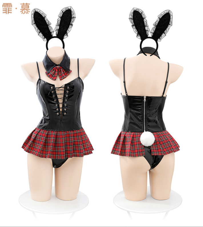Костюм состоит из мини платья (корсет из блестящего винила сшит с клетчатой юбочкой), воротничка с бантом и кроличьих ушек.