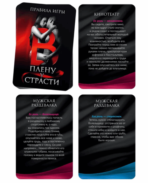 В пленуу страсти — игра, которая поможет Вам обоим  побыть не теми, кем Вы являетесь. Отдайтесь воле игры и станьте страстной фанаткой любимой команды, профессиональным атлетом или загадочной незнакомкой в тёмном зале кинотеатра. Позвольте себе и партнёру раствориться в этой чувственной ролевой игре.